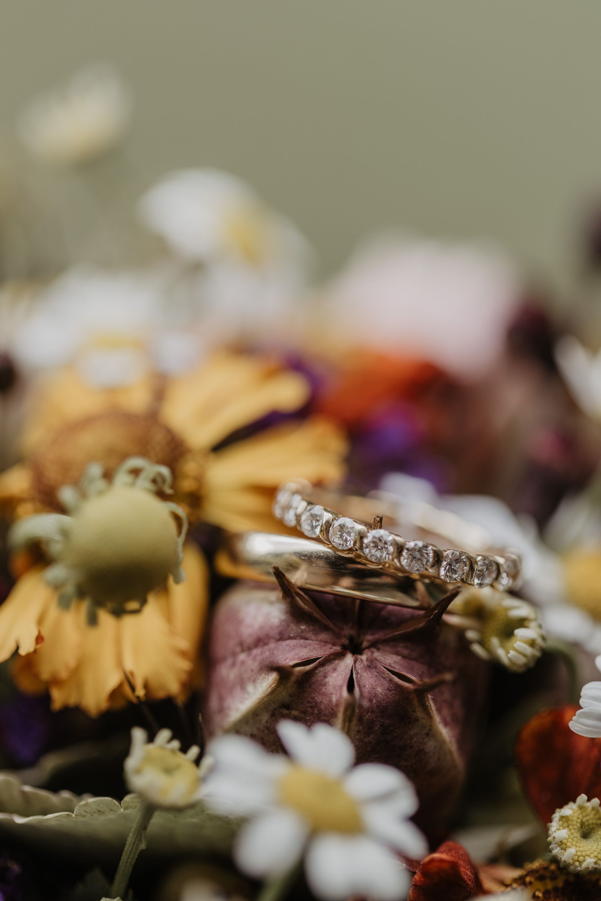 - Brautstrauß: Ein bunter Strauß aus Wiesenblumen wie Gänseblümchen, Löwenzahn und Margeriten.